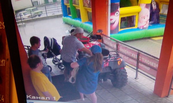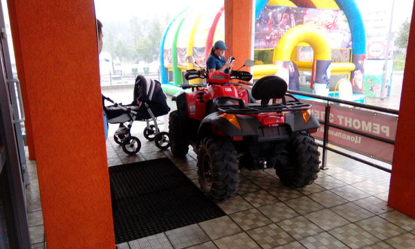 Все в трех фото. Квадрик заехал к дверям торгового центра по пандусу для колясок. Видимо, мужик решил, что можно, раз он с ребенком.