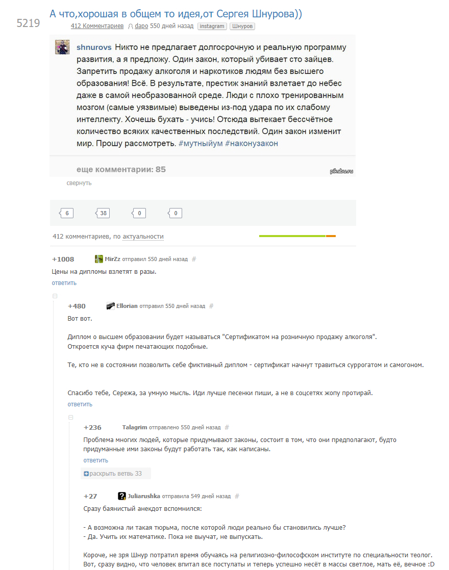 Если бы ты внимательнее читал мои комментарии - понял бы к чему я вел. Парень радовался что все бухающие люди вымрут нахер. Вот я у него и спросил: "Работать то кто будет?" Трезвенники и интеллигенты не идут в ПТУ. Да и сухого закона среди работников заводов я не наблюдаю.