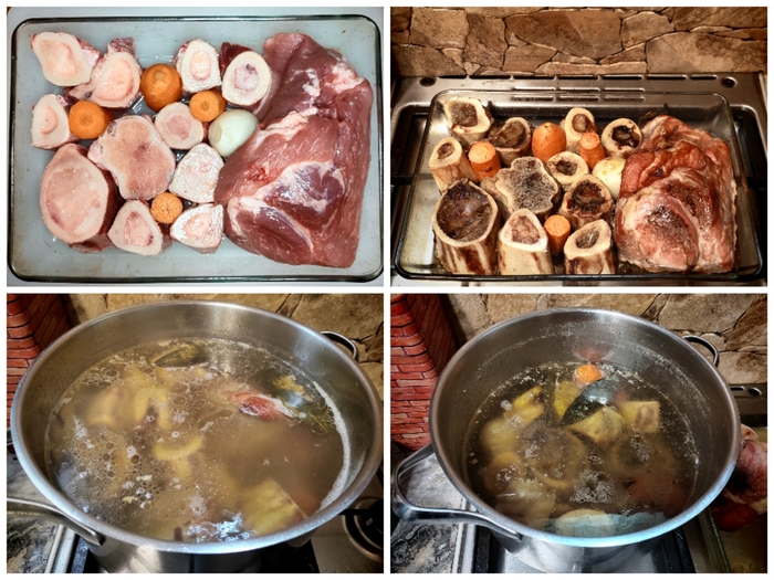 Складываем кости, мясо, лук и моркву в жаровню и ставим в духовку градусов на 150. На полтора-два часа. На самом деле, лучше посматривать на происходящее в духовке. Можно пару раз достать жаровню из духовки и обмазать мясо, кости и овощи вытопившимся жиром. В последние полчаса можно поднять температуру градусов до 180, чтобы всё покрылось мжвъчни корочкой.