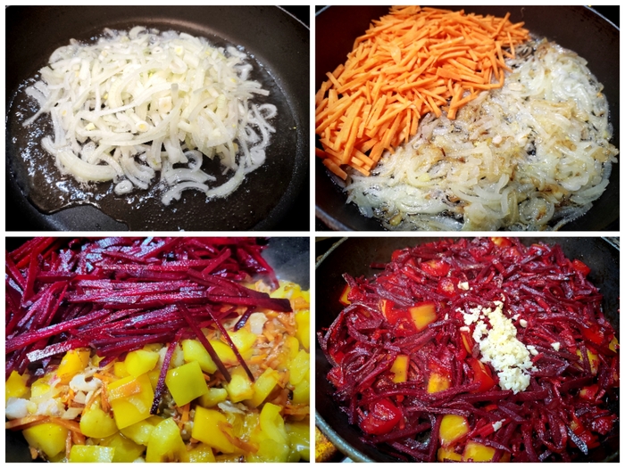 21. В сковороду всю свеклу (вместе с уксусом) и жарим-тушим на довольно сильном огне. Я бы сказал "до готовности", но знаю, как эта фраза всех бесит, так что, жарим "до полуготовности".