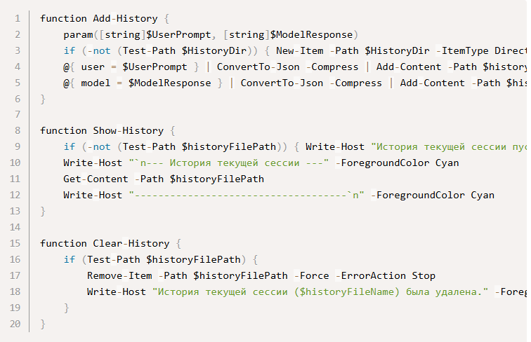 $HistoryDir = Join-Path... — формирует путь к папке для хранения истории диалогов (.gemini/.chat_history)