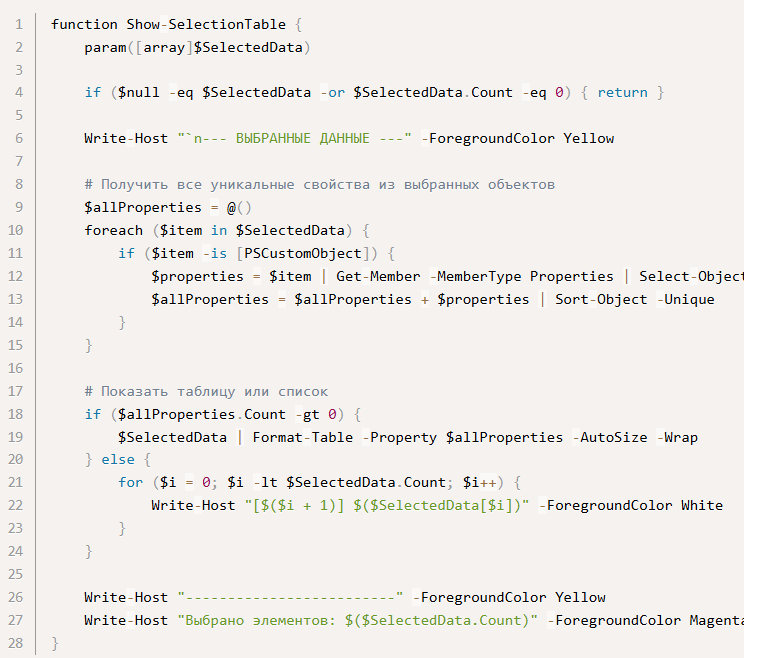 Задача функции: После выбора элементов в Out-ConsoleGridView показывает их в консоли в виде аккуратной таблицы, чтобы пользователь видел, что именно выбрал.