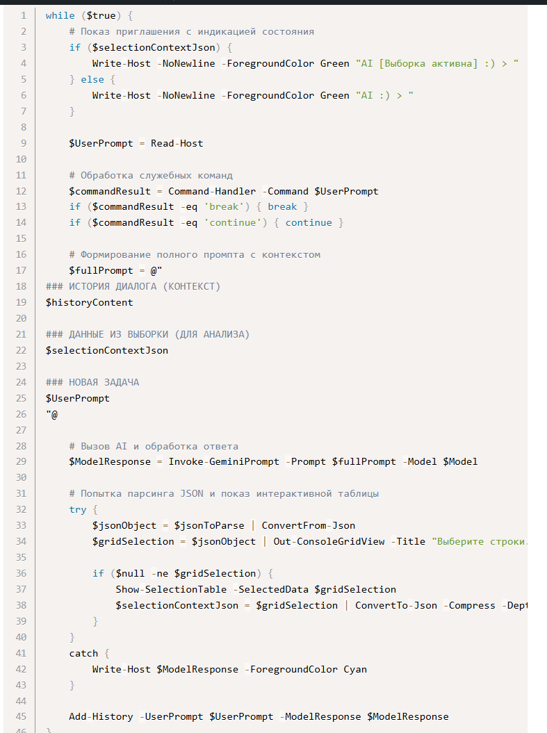 Полученный от AI ответ система пытается интерпретировать как JSON. Сначала она ищет блок кода в формате json..., извлекает содержимое и пытается его распарсить. Если такого блока нет, парсит весь ответ целиком. При успешном парсинге данные отображаются в интерактивной таблице Out-ConsoleGridView с заголовком "Выберите строки для следующего запроса (OK) или закройте (Cancel)" и множественным выбором. Если JSON не распознается (ошибка парсинга), ответ показывается как обычный текст в голубом цвете.