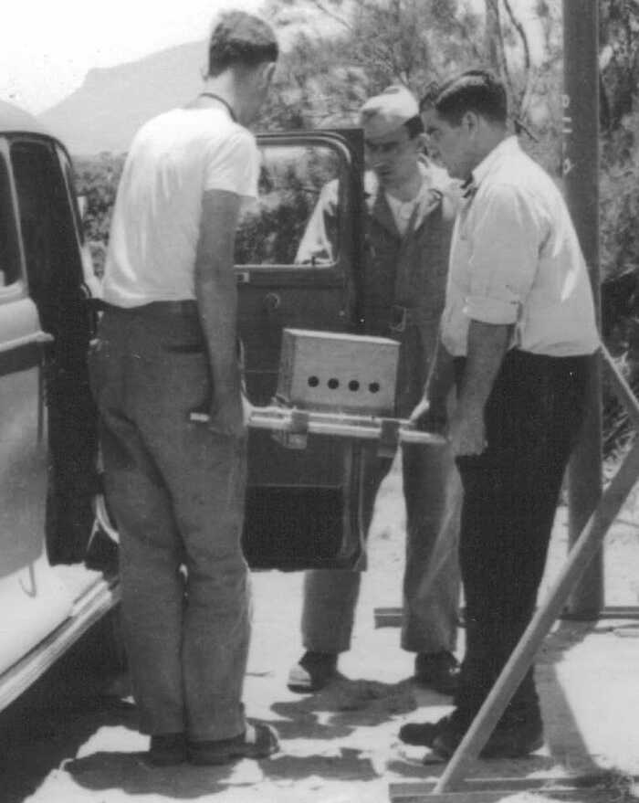 Подготовка первого в мире ядерного испытания, Тринити. Первый и второй человек слева - наши герои, Злотин и Даглян