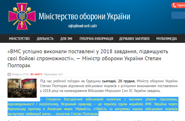 «Создан боеспособный воинский коллектив с высоким уровнем подготовки, ответственности и патриотизма. Яркий пример — это переход группы кораблей ВМС Украины через Керченский пролив в Азовское море», — сказал Полторак.