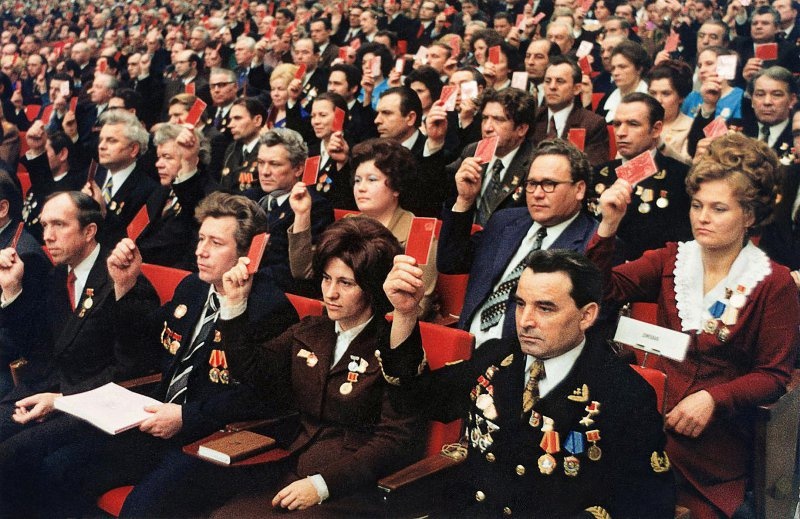 А вот очень известная фоточка. XXV съезд КПСС, голосования депутатов. Гендерный состав радует, с возрастом тоже все понятно - всем хорошо под 40 и за. У женщин красивые укладочки и даже парики. Но мне стало интересно не это. Это же сам процесс голосования идет, путем поднятия партбилетов? Чисто технически, как вообще такую прорву билетов, поднятых на таком низком уровне можно вообще сосчитать? При условии, что считающих девушек, как на публичных слушаниях в администрации города, например, не видать. Реально считали кто руку поднял или все это стало одной большой красивой картинкой? А если считали - то как?