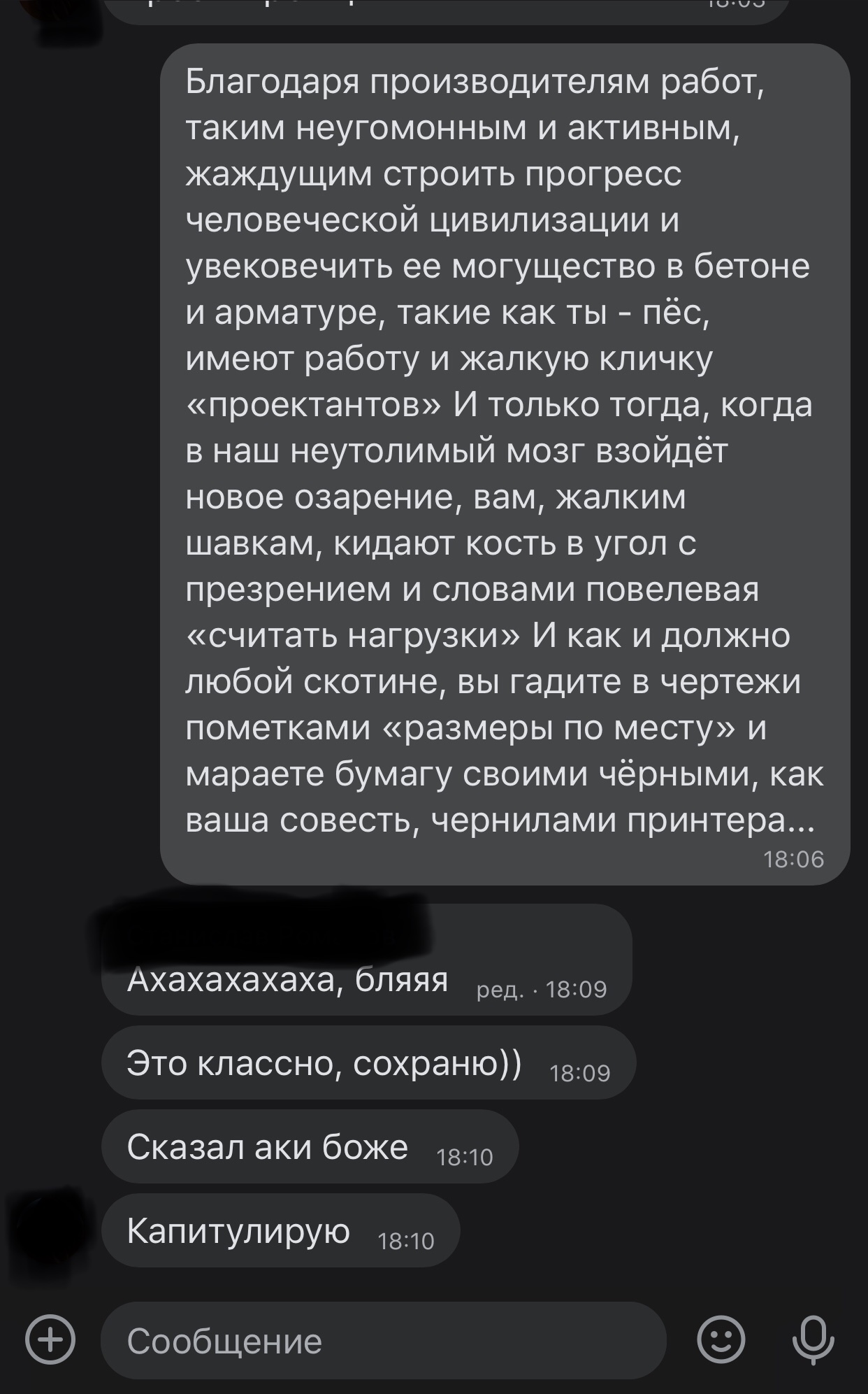 8 JopkaXopbka А как вы ставите проектировщиков на место? 5 лет назад Текст мой, друг мой, тег «мой», фоткал на каску, цели оскорбить чувства проектировщиков не преследую, проектанты - нелюди, все права защимлены. [моё] Проектирование Инженер Строительство Стройка Длиннопост Ещё 0