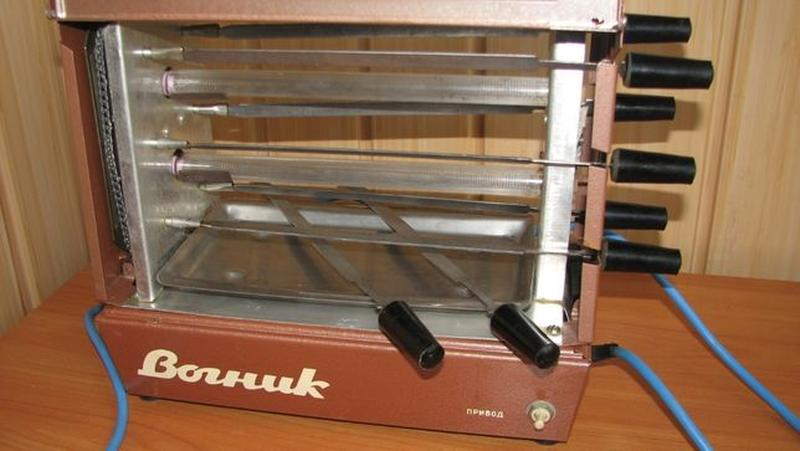 Они и сейчас продаются. Причем ровно такие же, как в СССР. Проблема этих электрошашлычниц в размерах - кусочки мяса туда влезали очень маленькие, на выходе получались сухарики.