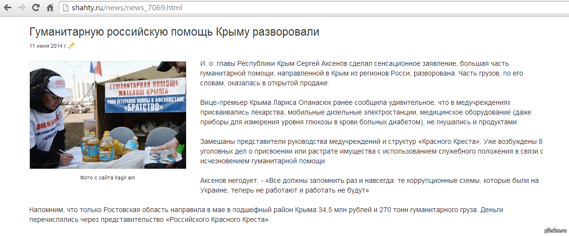 NikTux А Крыму ли помощь? 11 лет назад И. о. главы Республики Крым Сергей Аксенов заявил, что большая часть гуманитарной помощи, направленной в Крым из России, разворована. Крым Россия Гуманитарная помощь Кража Это же Россия