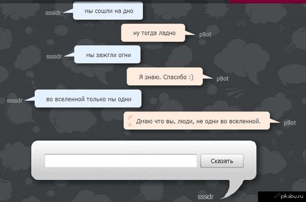 sssidr А мне он не стал подпевать :( 11 лет назад вдохновившись http://pikabu.ru/story/_2402851 [моё] Чат-бот Чат Сплин Скептик