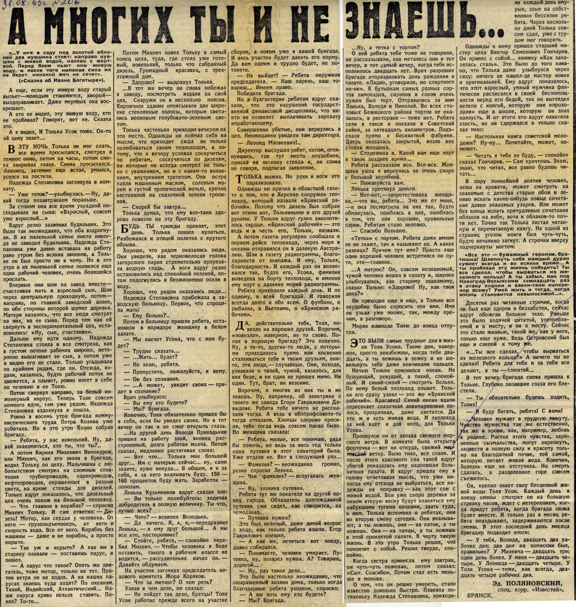 Сегодня шестая одна из его ранних работ. Последняя опубликованная в "Брянском рабочем" и первая опубликованная в "Известиях". Как я слышал, наш дедушка, журналист Эдвин Луникович Поляновский перешел из "Брянского рабочего" в "Известия" по конкурсу. И судя по публикации в обоих газетах, (когда в "Брянском рабочем", у нас не сохранилось, а в "Известиях" 31 августа 1965 года №206). Это последняя работа в "Рабочем" и первая в "Известиях". Именно с нее начался его многолетний труд в этой газете.