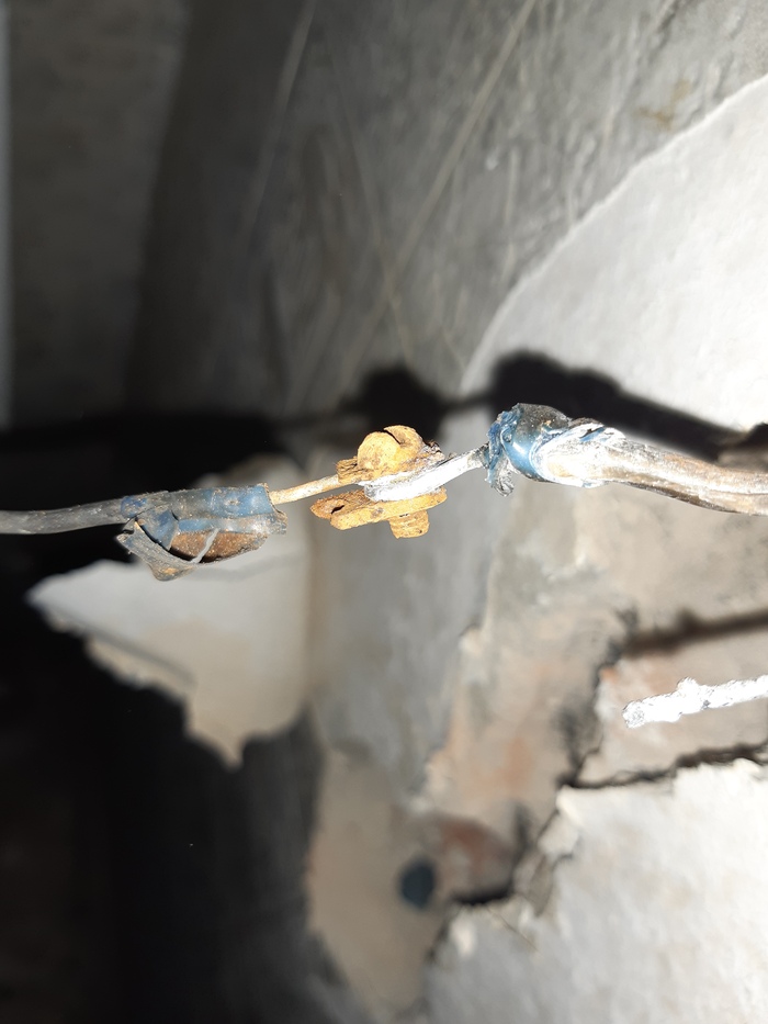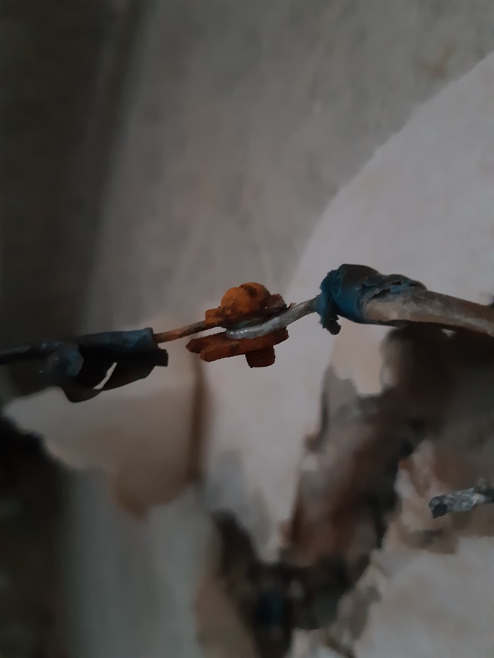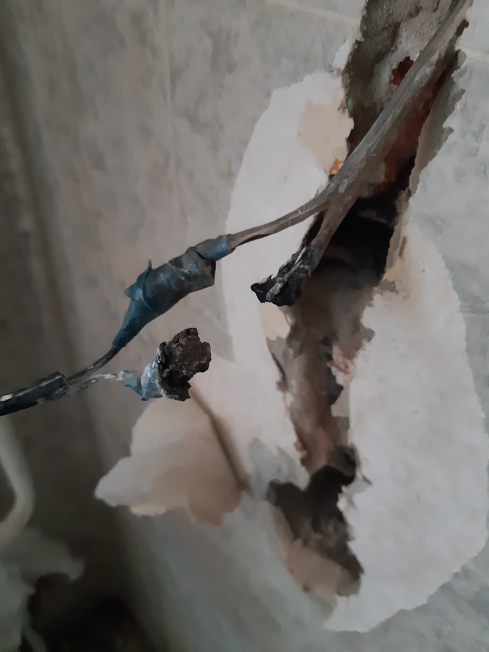Переехали в другую квартиру. От предыдущего хозяина остался какой-никакой ремонт, поэтому с ним решили не спешить, а поднакопить немного, чтобы сразу делать нормально. Первое время всё было хорошо. Но однажды, сидя на кухне и ожидая когда закипит чайник, я почувствовал запах горелого пластика. Оборачиваюсь, а из розетки чёрный дым валит. Первым делом, выдернул чайник из розетки и полностью вырубил щиток. Дым валить перестал. Разобрал розетку и обнаружил, что концы провода в ней почернели и сама розетка немного оплавилась. Считая себя не совсем безруким, купил новую розетку, зачистил концы провода, всё аккуратно собрал и довольный включил чайник. Через секунду дым повалил ещё сильнее. Снова всё обесточил и стал выяснять, что происходит. Самым логичным было долбить стену и идти вверх по проводу, т.к. сколько я не обстукивал стены, коробки не нашёл. Поиски длились недолго. От увиденного чуть плохо не стало. Смотрите сами