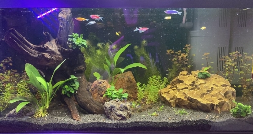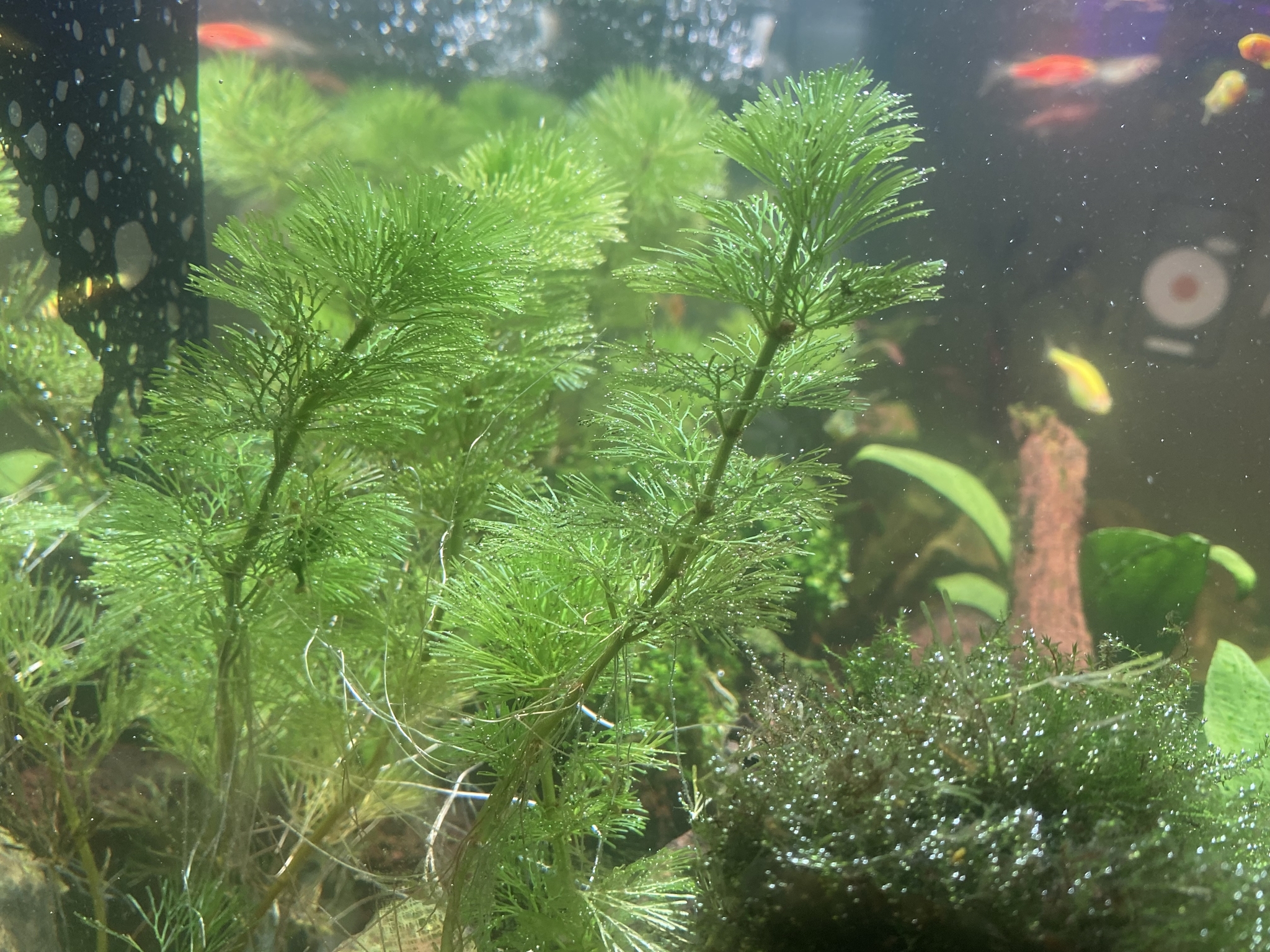 С покупкой новой лампы было решено расширить выбор растений. Были выброшены потрепанные. Остались только анубиасы и криптокорина. Сначала купили мох стринг и Монте Карлу. Они отлично прижились, после докупили кабомбу и альтернатеру.