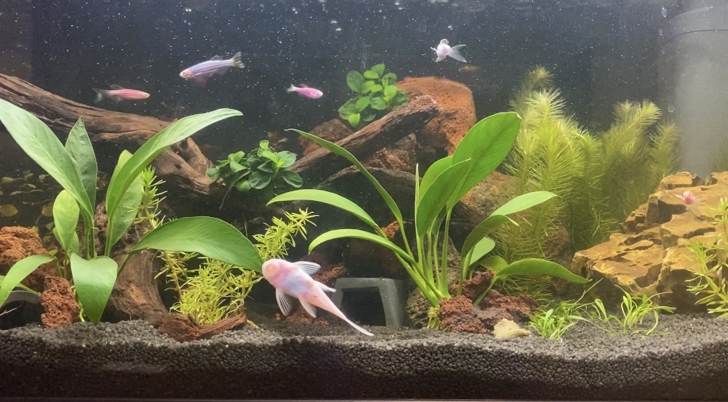 Показатели воды к этому времени стабилизировались. Стайка данио пополнилась новыми цветами. Мы купили также керамические укрытия и решили сделать перепланировку, чтобы попытаться вписать их в обстановку.