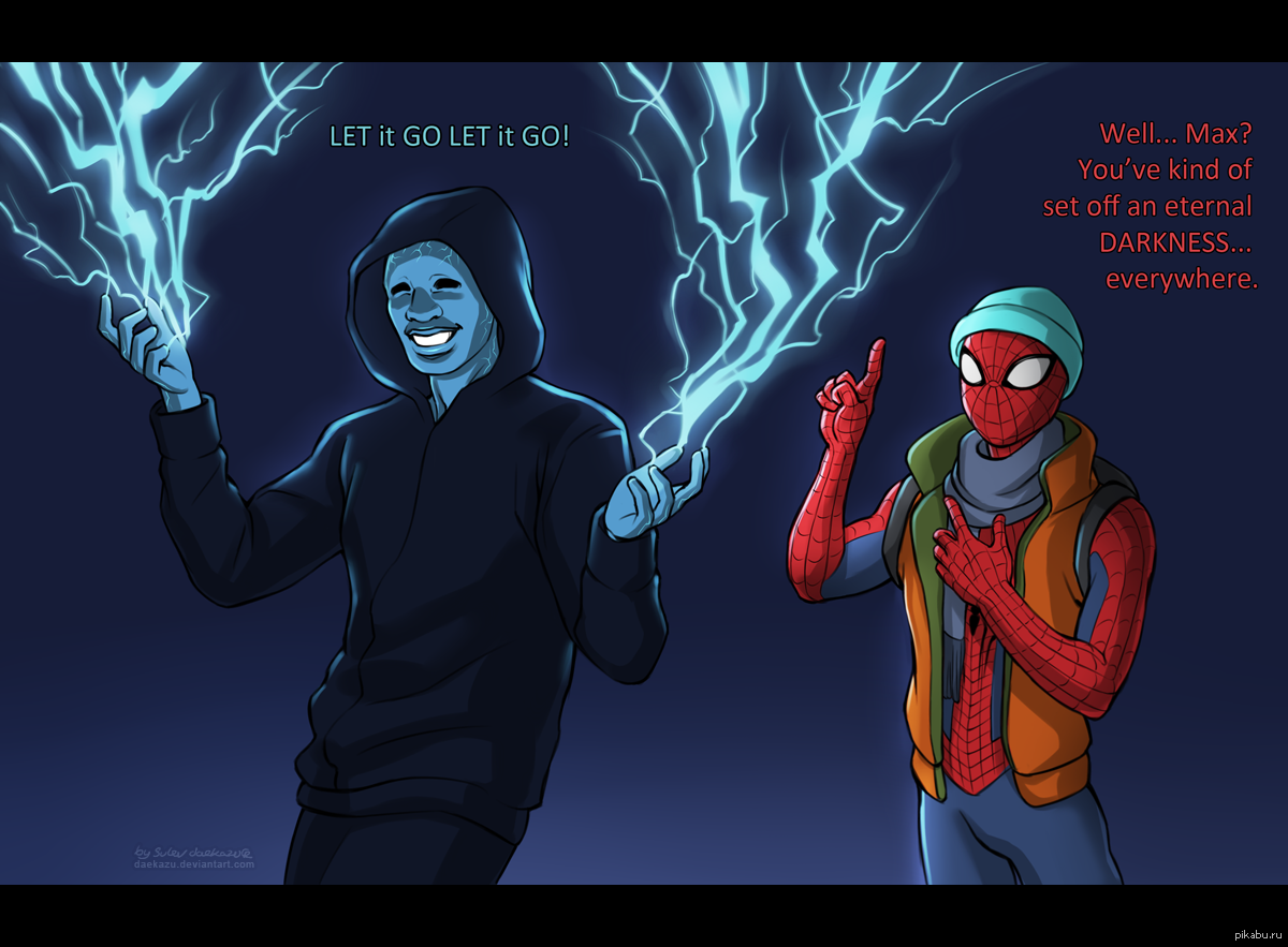 Diemon007 А почему бы и нет. 11 лет назад Мой корявый перевод: Макс: (Поёт песню из "Холодное сердце") Спайди: Эмм... Макс? Ты же вроде погрузился во тьму... полностью. Новый Человек-паук: Высокое напряжение Frozen Let It Go Человек-паук Холодное сердце