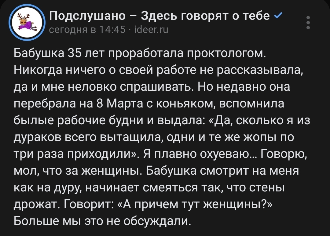 3400 Dememtor Подслушано А при чем тут женщины? 1 год назад Проктолог Бабушка Воспоминания Скриншот Подслушано Мат 84 5 3 3 1 Ещё 0
