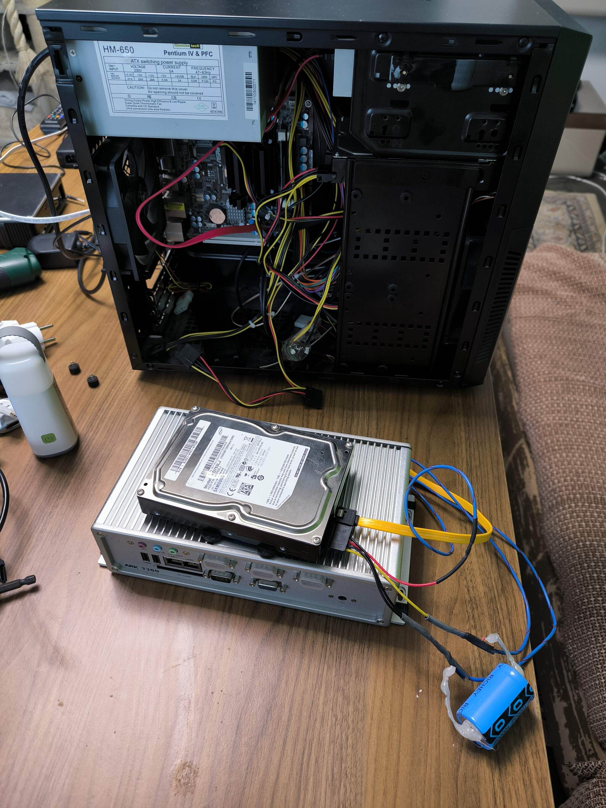 Если кто не заметил - для стабилизации работы пришлось на линии 12 вольт навесить огромный внешний кондюк. Было подозрение что внешний питальник (12 вольт) даёт шум, после этого рукоблудия стало явно лучше. Вообще, это писюк индустриального формата, на Атоме. Внутреннее пространство только под диск 2,5 но я вытащил кабеля и сверху держал диск 3,5 на мягких подставках. Кроме диска, больше движущихся деталей нет, пыль не собирает, не шумит. то есть не шумел.