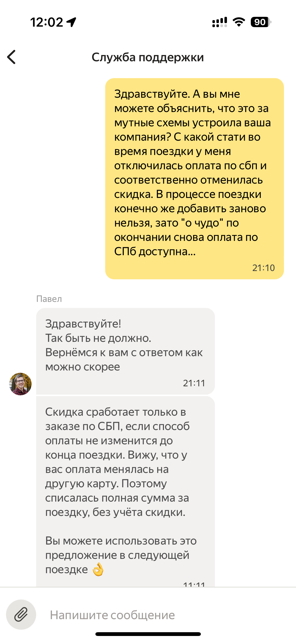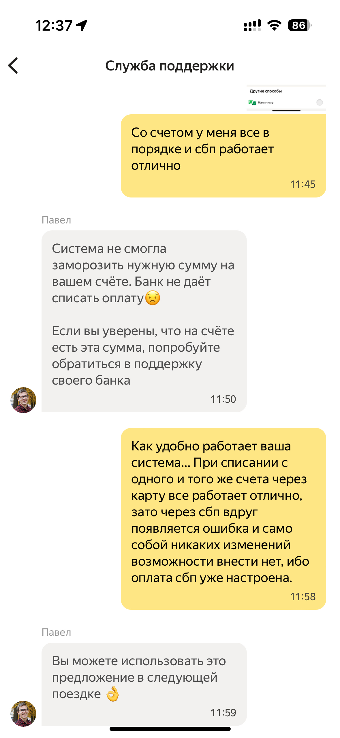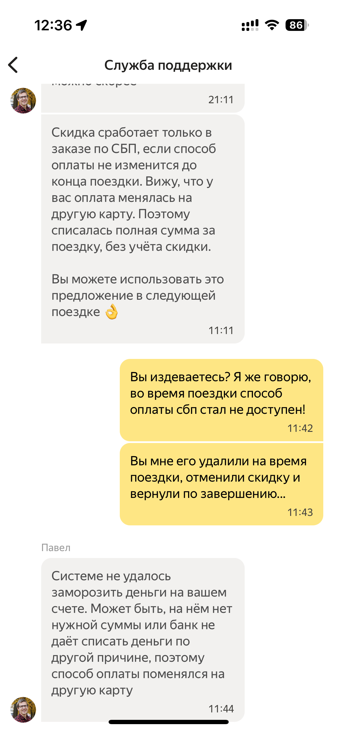 Случилась со мной вчера не большая неприятность. Приезжаю домой после работы и понимаю, что оставил ключи от дома на работе. Пришлось возвращаться. И чтобы сэкономить время я решил воспользоваться такси. И тут к своей удаче(нет) я обнаружил интересное предложение. 30% скидка при оплате через СБП. Надо брать. Способ оплаты добавлен, стоимость рассчитана и я отправился в путь. Но тут начинает творится магия... Происходит ошибка оплаты, СБП исчезает из способов оплаты и возможность добавить заново отсутствует (нажимаешь подключить СБП и тебя просто перекидывает в список способов оплаты), и скидка больше не доступна. Но как только поездка завершается происходит чудо, СБП вновь доступен и я могу вновь воспользоваться этим шикарным предложением. Обращение в техподдержку ожидаемо ни к чему не приводит, ибо наказ у них простой - шли всех на х.., мы прекрасны (проблема на стороне вашего банка). Ну и как итог: деньги на счёте были(этот же счёт использует карта, с которой произвелась оплата), сбп подключен и работает, с банком проблем не замечено. 200 руб. сумма не великая, но вот ситуация не приятная.