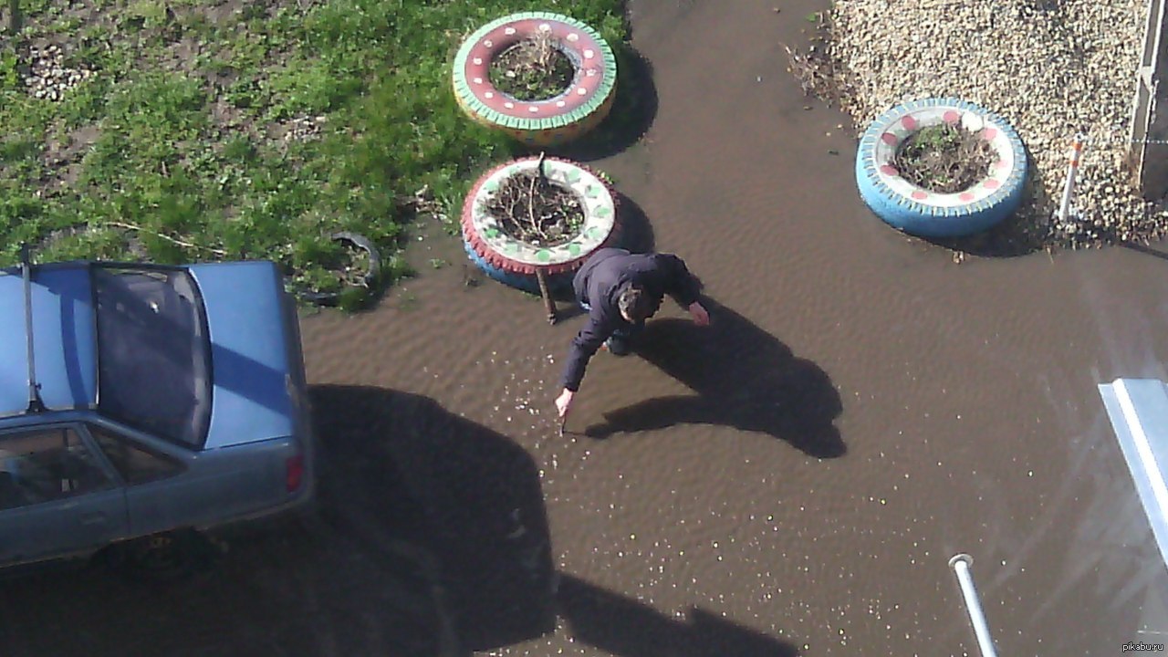 9 timewalker А у нас второй день дожди. 11 лет назад Краснодар. Мужик пытается перейти улицу, переставляя камни. Краснодар Полоса препятствий Happy Frog Топит Помощь Без паники Лужа