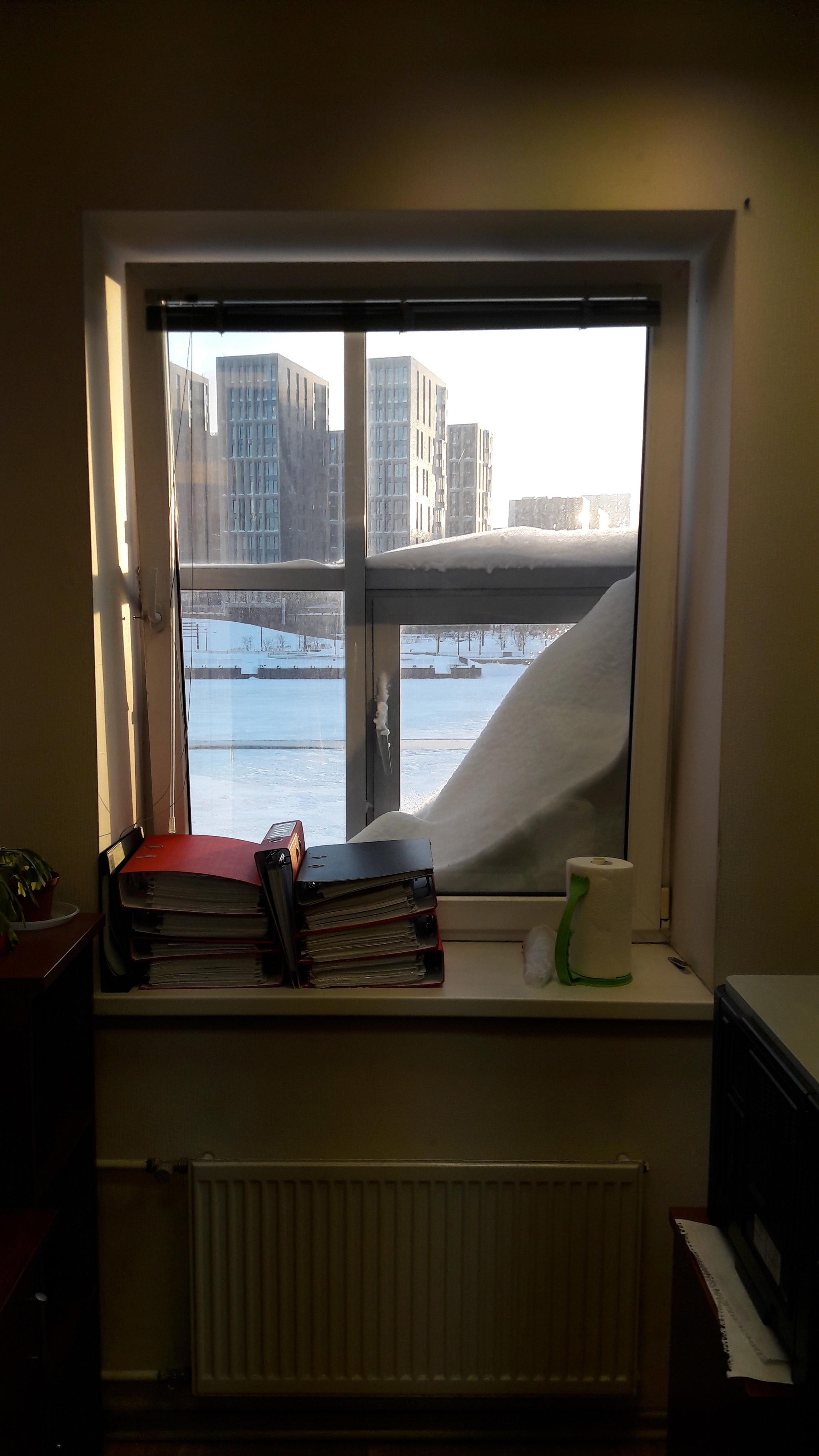 вот такую картину застал утром в офисе, между внутренним и внешним окном надуло сугробик,  внутреннее окно открыл уже сам по приходу (ибо что-то с сугробоим надо делать), если что второй этаж офисного здания.