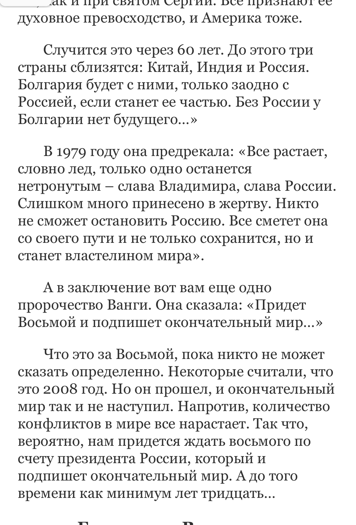 Да и вообще, я не настаиваю, что так оно и будет. Просто говорю, что предсказания Ванги насчёт конкретно Владимира были лично мне известны задолго до появления на арене Путина. Но Вы вполне имеете право мне не верить, нет проблем. Я тоже пока из сбывшегося только черных людей и Владимира вижу, до благосостояния России далеко, как до Марса.