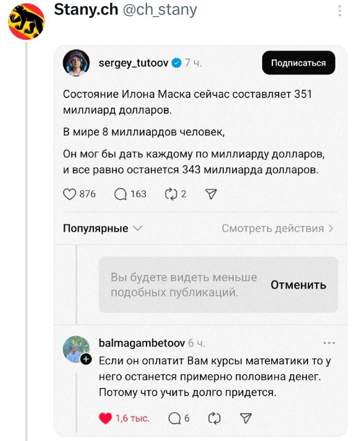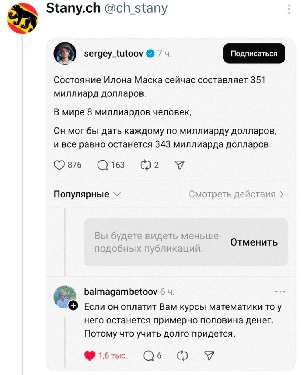 531 Kayomaru Баяны А ведь мог бы всех людей миллиардерами сделать!1 Серия В следующем месяце я это выкладываю 2 месяца назад Скриншот Математика Илон Маск Деньги 72 16 3 3 2 1 1 Ещё 2