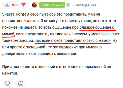 Есть такое, прямая цитата: "То есть ощущение про близкое общение с мамой, если представить, ну типа как с мужем, у меня вызывает такие же эмоции, как если я себе представлю секс с мамой."
