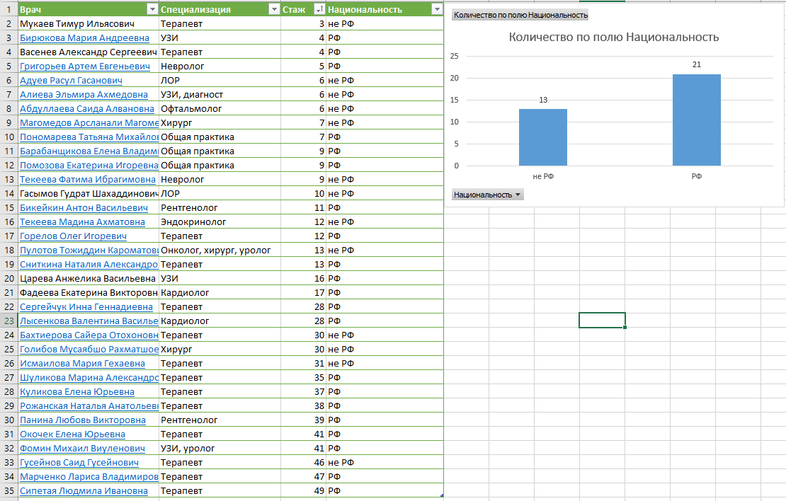 Зайдя на сайт https://prodoctorov.ru/moskva/lpu/22121-gorodskaya-poliklini... можно просмотреть всех врачей. И вот что любопытно - всего в больнице работает 34 специалиста, из них 13 имеют не русские ФИО. т.е. всего чуть больше трети. У меня нет точных данных насколько этот сайт актуален, но вот табличка с более подробной инфой и стрёмным графиком(заранее сорри за обозначения, сначала не додумался как обозвать этот столбец, потом лень стало):