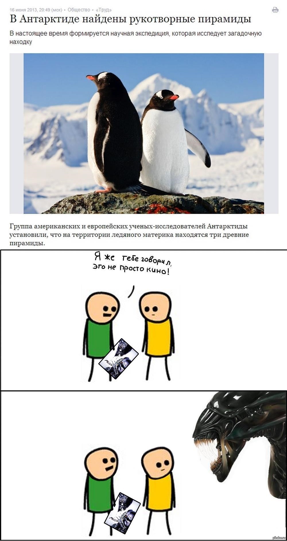 9 Absent09 А вы как думали? 12 лет назад Кто не смотрел фильм "Чужой против Хищника" - сюжет как раз в пирамидах, найденных в Антарктиде. Новость: http://news.mail.ru/society/13522768/?fromm [моё] Чужой против Хищника Новости Антарктида Пирамида