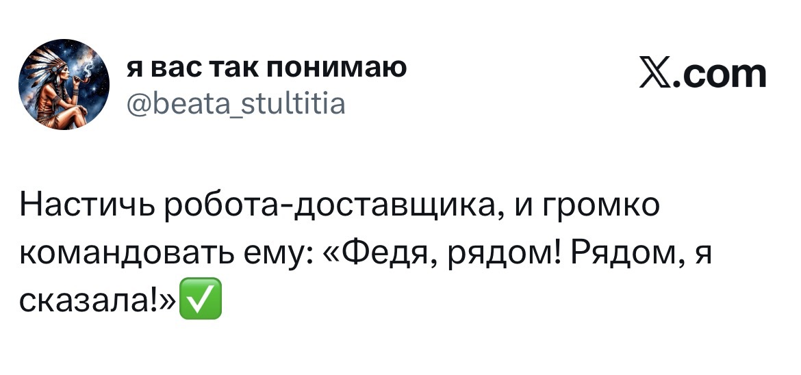 3 AlinaMalinovna Юмор А вы как с ними разговариваете?) 12 часов назад [моё] Юмор Робот-курьер X (Twitter) 1 Ещё 0