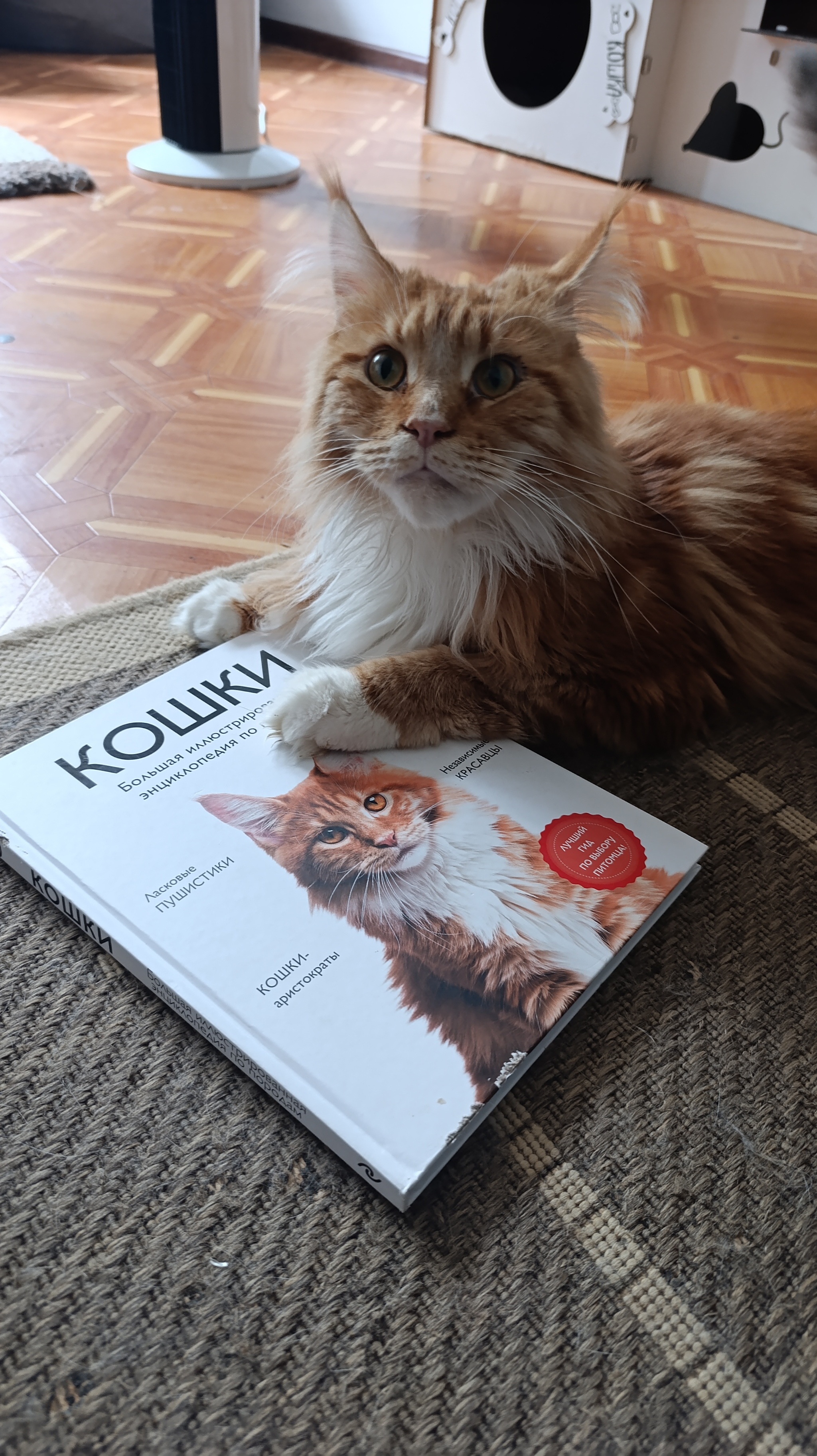 Тихон, с его пушистой шерстью и выразительными глазами, кажется, полностью погружен в чтение. Его лапы аккуратно сложены на обложке книги, словно он внимательно следит за каждым словом. Тихон — настоящий ценитель литературы, и его любовь к книгам вдохновляет всех вокруг.