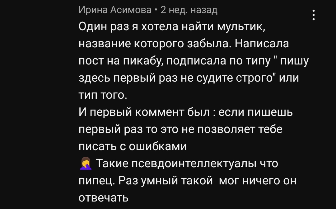 Я предпринял несколько попыток найти акк этого блогера на Пикабу, но все это не увенчалось успехом, к сожалению, надеюсь, что если этот пост залетит выше, и ты сможешь его прочитать, то сможешь понять, что: если кому-то не понравилось твое творчество, это не значит, что он плохо живёт и ходит на нелюбимую работу и пытается самоутвердиться за чужой счёт. Кого я обманываю, я на Пикабу только за этим.