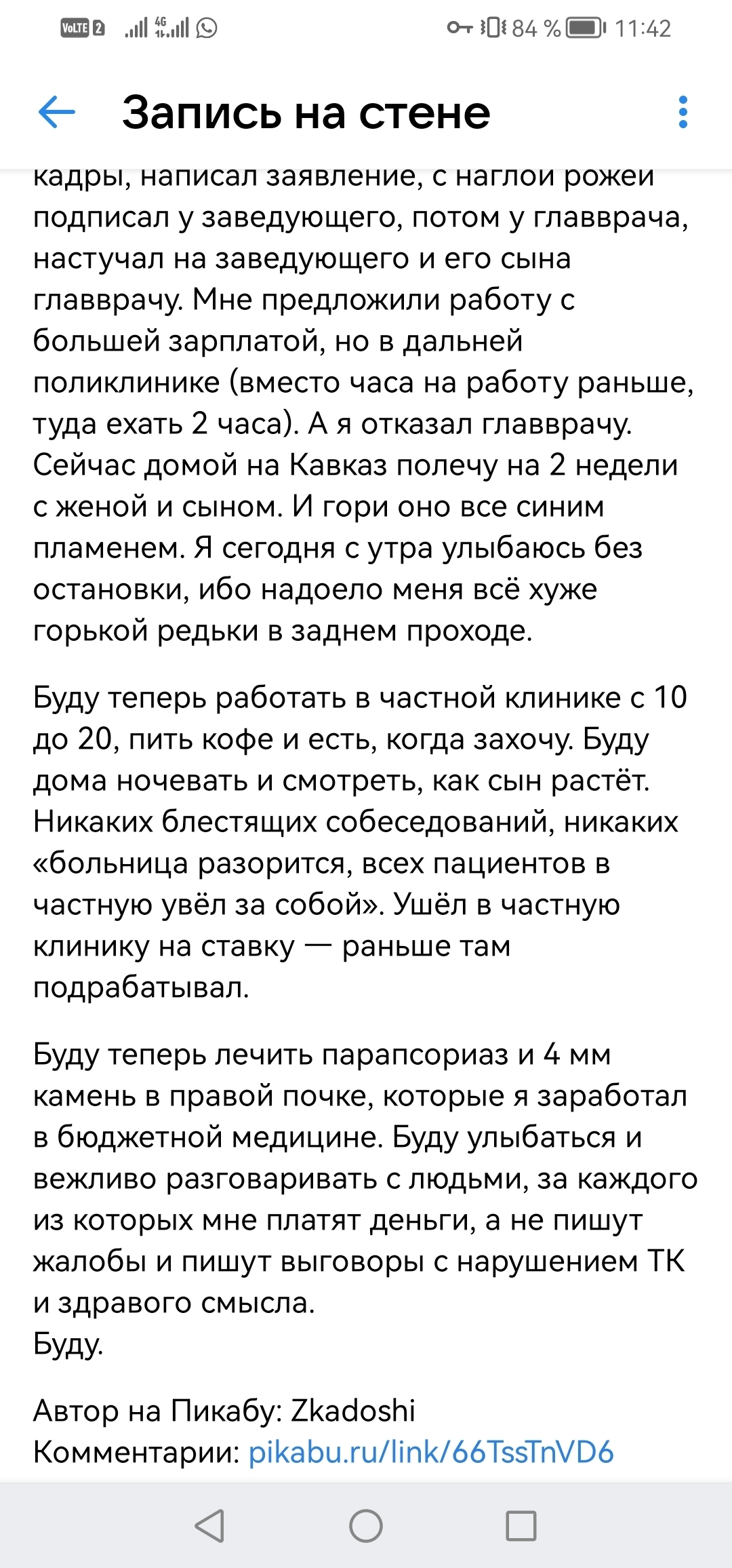 Отдежурил в приёмном отделении, пошёл в кадры, написал заявление, с наглой рожей подписал у заведующего, потом у главврача, настучал на заведующего и его сына главврачу. Мне предложили работу с большей зарплатой, но в дальней поликлинике (вместо часа на работу раньше туда ехать 2 часа). А я отказал главврачу. Сейчас домой на Кавказ полечу на 2 недели с женой и сыном. И ебись оно всё конём. Я сегодня с утра улыбаюсь без остановки, ибо заебало меня всё хуже горькой редьки в заднем проходе.