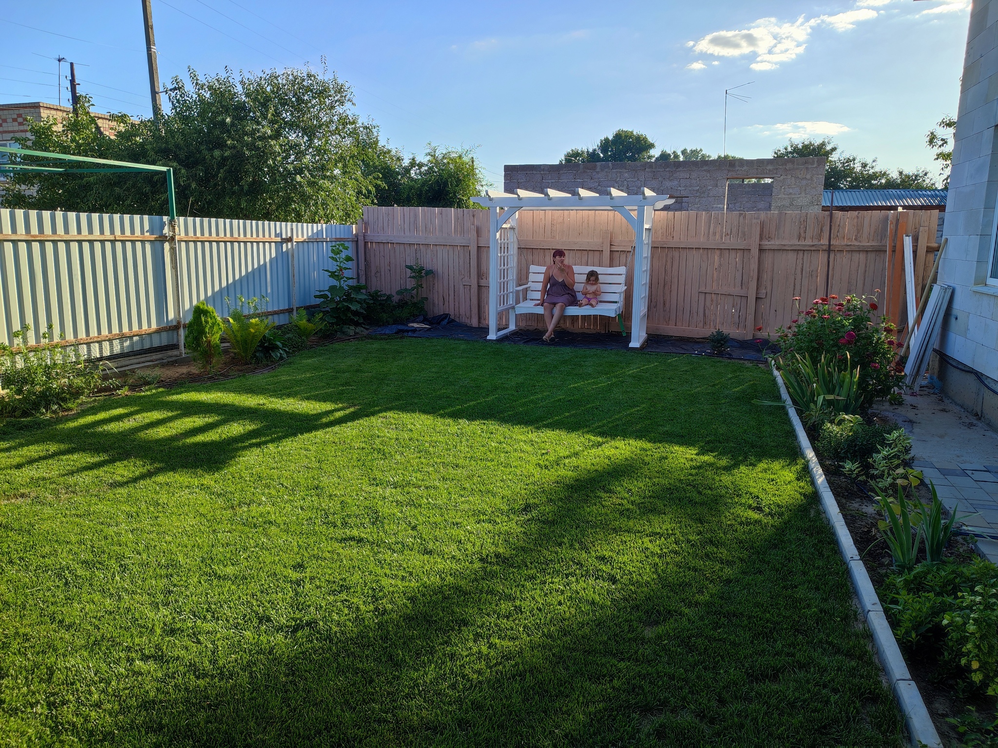 Осталось сделать только забор) Всё остальное делал своими руками: газон с автополивом, клумбы с капельным поливом, качели (есть подробный пост в профиле).