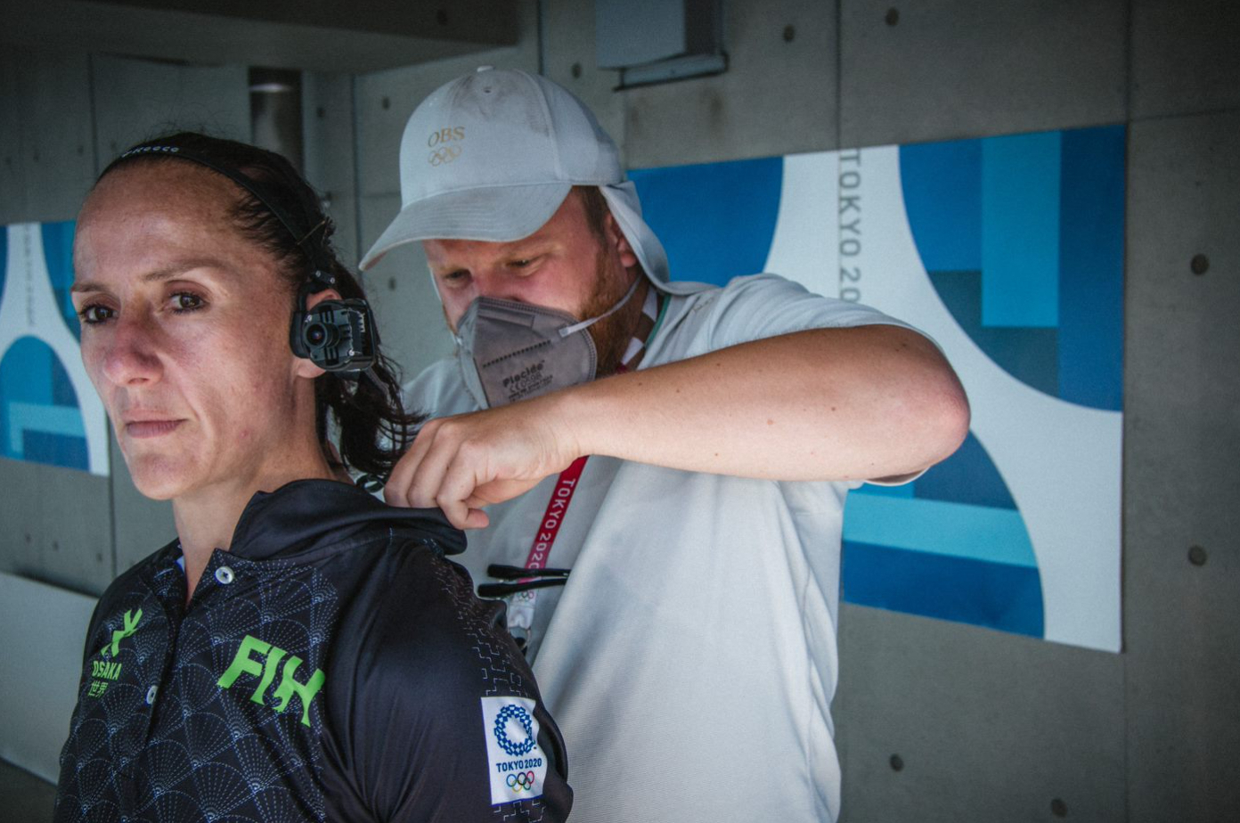 На фото прикручиваю носимую камеру к судье на соревнованиях по Хоккею на траве в рамках ОИ Токио 2020.