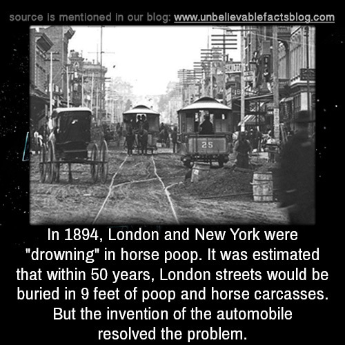 «В 1994 году Лондон и Нью-Йорк просто "утопали" в лошадином навозе. Было подсчитано, что через 50 лет улицы Лондона были бы погребены под почти трехметровым слоем навоза и лошадиных скелетов. Однако, проблему решило изобретение автомобиля».