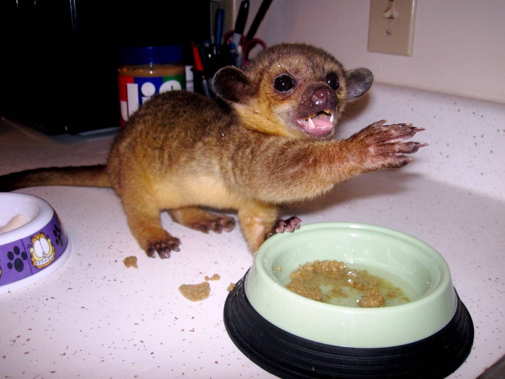 Питаются они в основном фруктами и нектаром, а ещё обожают мёд, в поисках которого регулярно разоряют пчелиные ульи. Но временами не прочь закусить какой-нибудь ящеркой или птичьими яйцами, которые маленькие воришки тоже ловко тырят из гнёзд беспечных родителей.