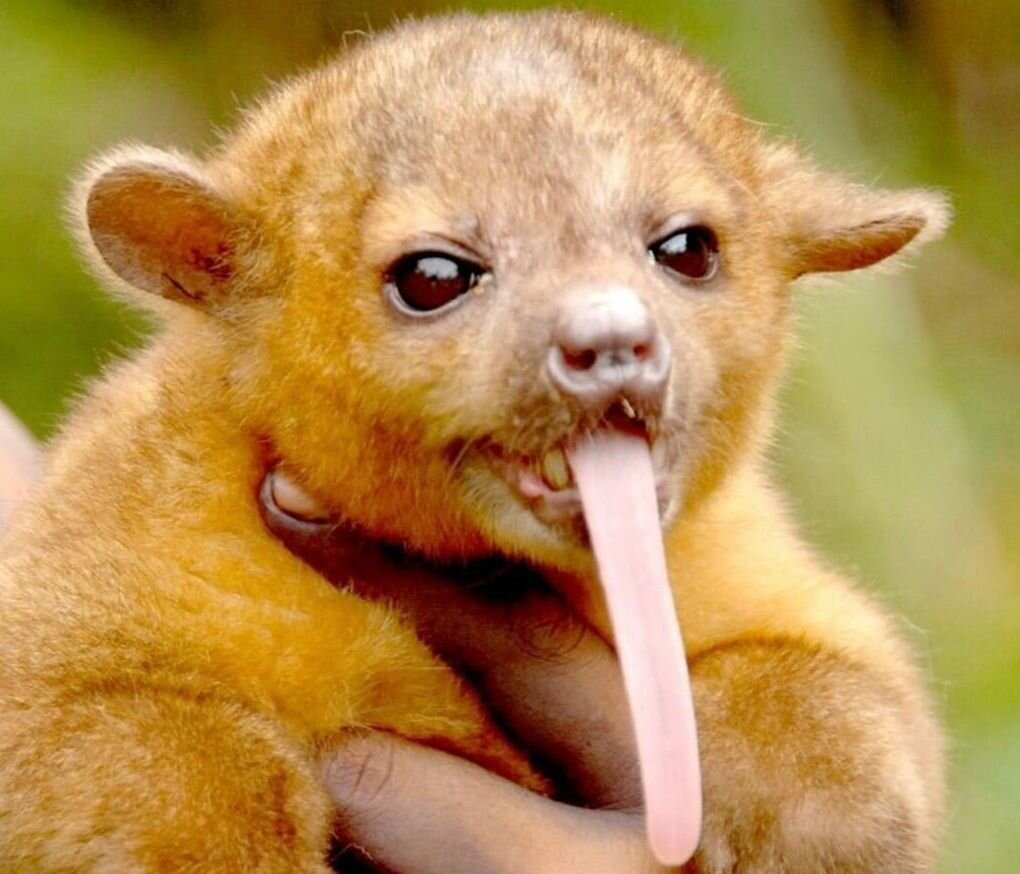 Ну-ка скажите мне, на кого похож этот зверёныш? На мишку, кошку или обезьянку? Да ещё и язык как у муравьеда! Вот и учёные не сразу разобрались. И всё же после генетических тестов вынесли вердикт: зверёк – представитель семейства Енотовые, а зовётся он кинкажу.