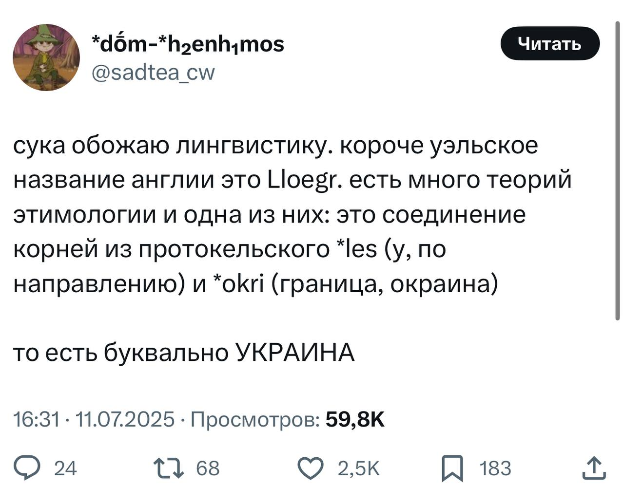 2327 MirVcegda23 Университет мемологии Политика А-а, ну вот теперь все встало на свои места1 7 месяцев назад Галковский был прав! Юмор Скриншот Политика Англия Украина Кельты Лингвистика X (Twitter) 277 29 3 2 2 2 Ещё 1