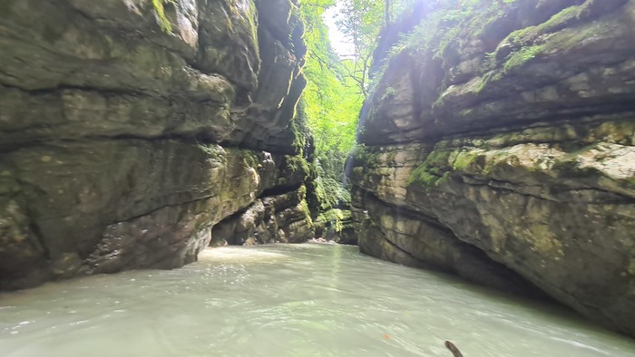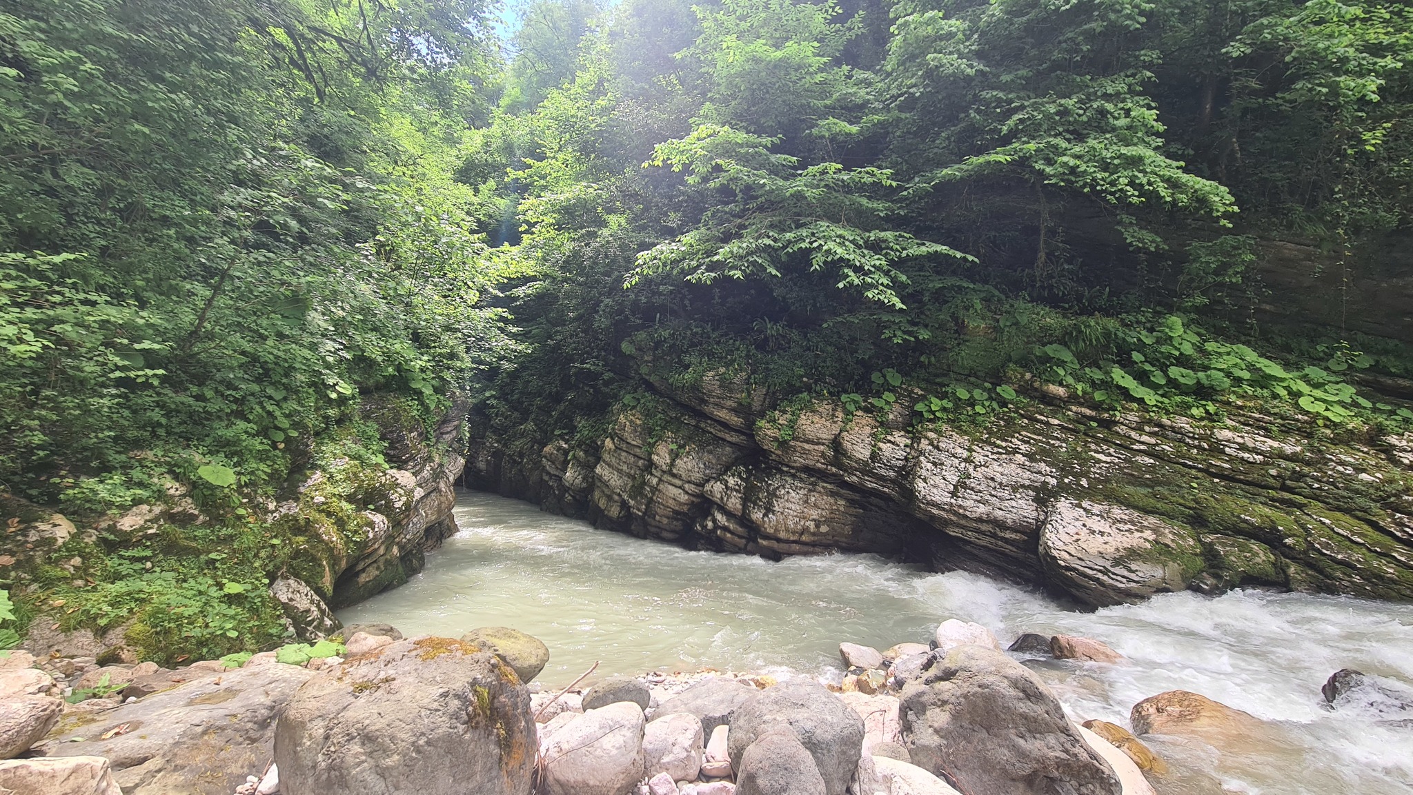 Благо он расположен был недалеко от места моей дислокации, дело за малым, взял мотор и поехал в сторону каньона. Добравшись до реки Хашупсы, выше каньона по течению, переобулся в резиновые тапочки и пошёл вниз по течению к каньону. Ничего не предвещало беды. Ни быстрое течение, ни полноводность реки) пройдя несколько перекатов и несколько раз реку в брод, река сужалась, течение усиливалось, глубина от колен доходила до пояса, и когда мне в голову пришла умная мысль повернуть назад, типа ну его нах, потом посмотрю, понял что против течения я уже не выйду, только вперёд) ну и собственно ничего другого не оставалось, как идти вперёд. Местами после порогов глубина была выше моего роста, приходилось плыть, благо нашел шест, и отталкивался ото дна с помощью него. В общем добрался до самого каньона, оно того стоило) красота невероятная!