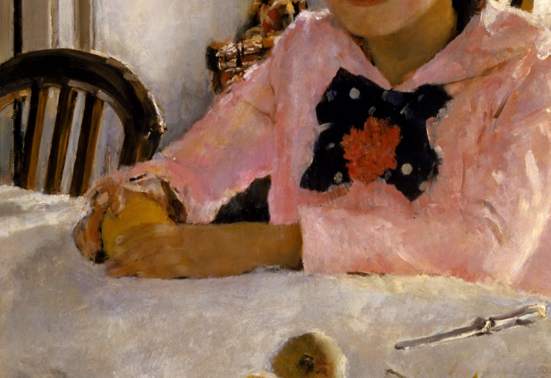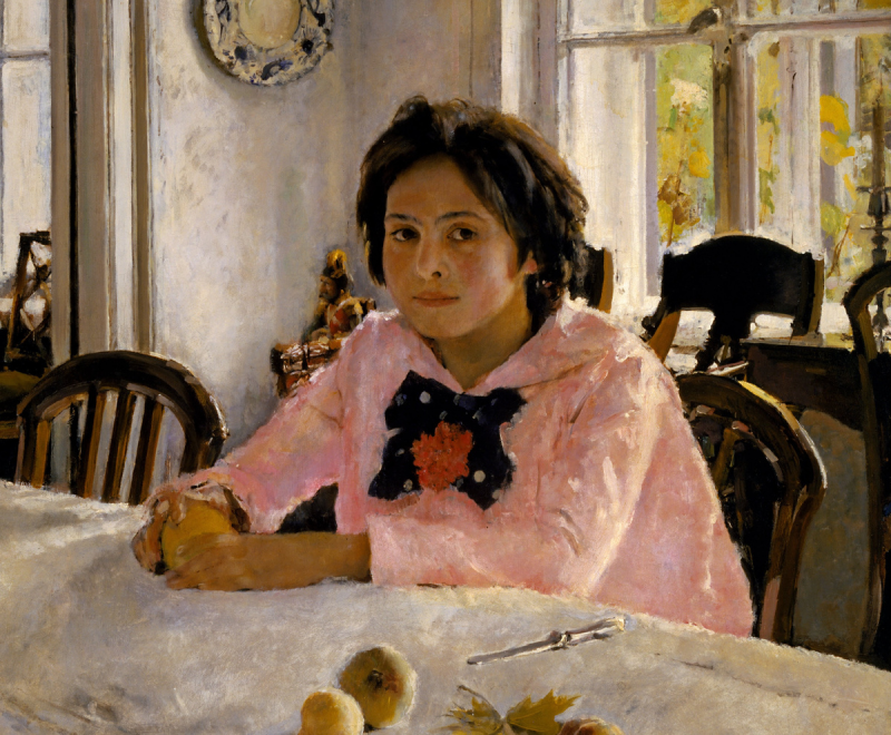 Серов виртуозно играет на контрастах: но не на черном и белом, а на теплом и холодном. Холодные голубовато-зеленые тона фона и стола – и теплое сияние Веры: ее смуглая кожа с румянцем, карие глаза, темные волосы. Розово-белая гамма платья и персиков – и дерзкий черно-белый бант. Тончайшая лепка лица, где виден каждый оттенок жизни – и смелые, почти эскизные мазки на руках, скатерти, листьях. Кажется, вот-вот дрогнет ресница, и Вера сорвется с места – ее спокойствие обманчиво. Взгляд! Загадочный, чуть хитрющий, полный ожидания: вот закончу позировать и снова в сад, к играм!
