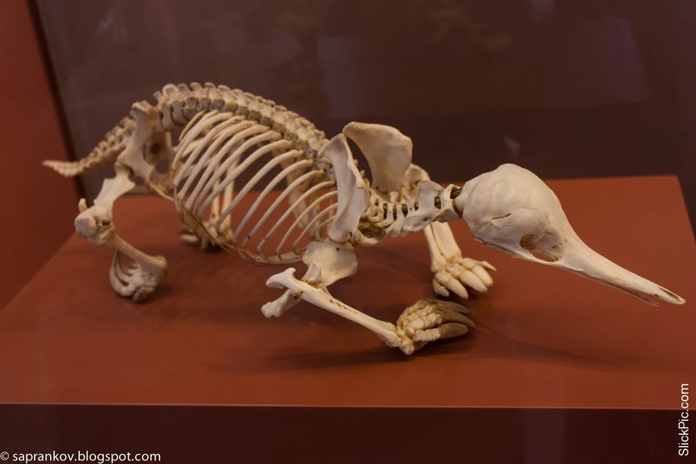 А вот внутри ехидны много противоречий и интересностей. Голова, лопатки и грудная клетка по строению очень похожи на рептилоидные. Так как это промежуточный вариант молочника, то много штук в организме неудобные. Например, у нормальных млеков расстояние от уха до слуховой кости очень короткое. А у ехидны ухо за глазом, да и ухо представлено дыркой.