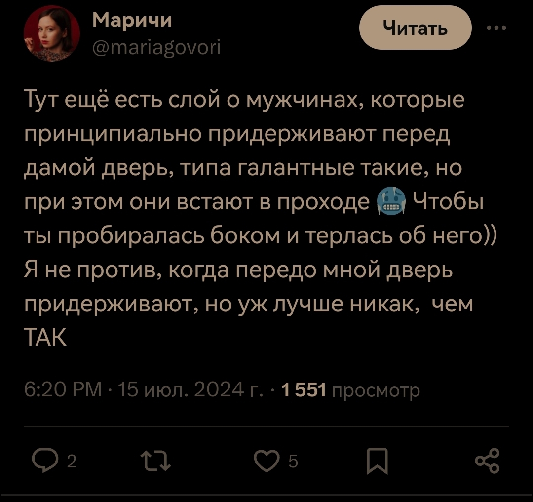 Кажется, я понимаю, о чём она. Когда дверь открывается от себя и происходит такая ситуация - он из вежливости её открывает и пытается пропустить даму вперёд, а сам в итоге стоит в проходе, вместо того, чтобы просто зайти и придержать дверь. Только в большинстве своём мужчины делают так не специально всё-таки, а просто в моменте сообразить не успевают )