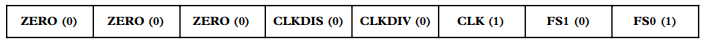 Регистр Clock содержит делитель тактовых импульсов на 2 (бит CLKDIS), бит выбора частоты кварцевого резонатора (бит CLKDIV) и биты CLK FS1 FS0 определяющие скорость опроса АЦП (частота дискретизации).