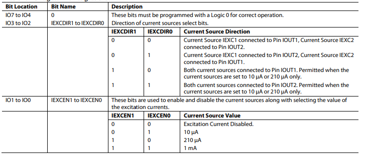 АЦП AD7793 содержит два программируемых источника тока номиналами 10 мкА, 210 мкА, 1 мА. Токовые выходы IOT1 и IOT2 могут независимо работать друг от друга, а источники тока могут быть направлены в один токовый выход.