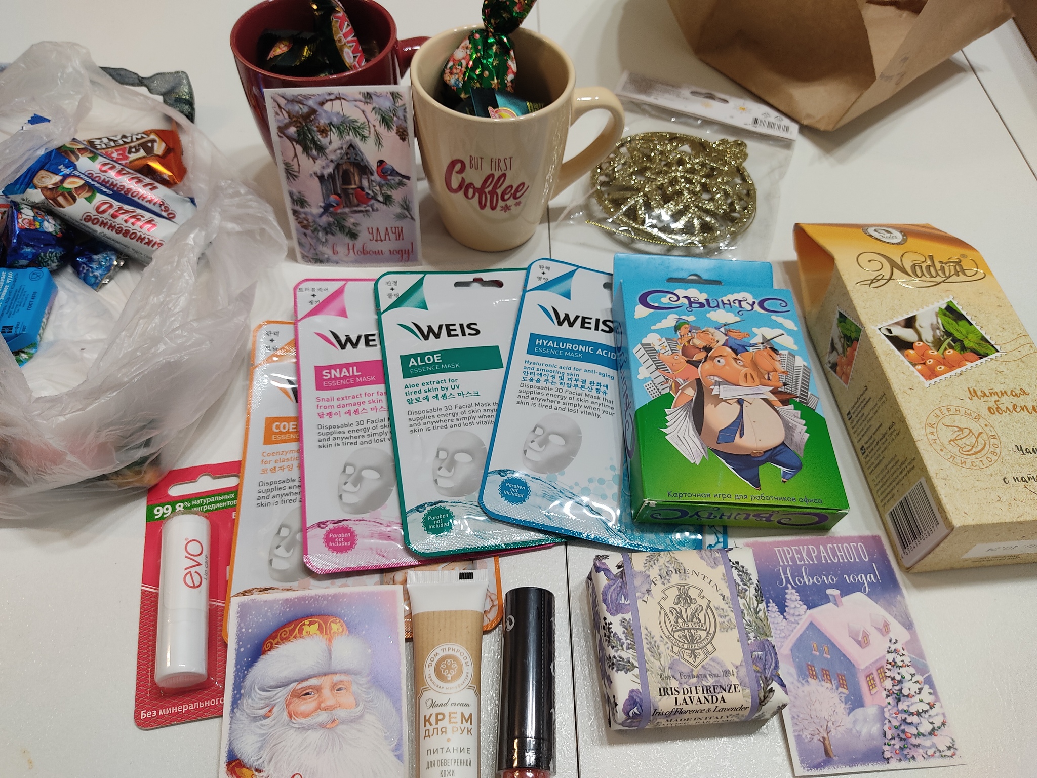 Я уже много раз участвовала в различных обменах подарками, и всегда-всегда получаю хорошие подарки, наполненные заботой и добротой. В этом году посылка пришла очень быстро,рано. Была мысль подержать ее до 31 числа,но нет, разве любопытные члены семьи позволят))).