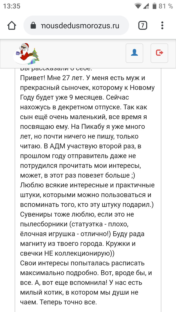 Предвижу комментарии вроде: "многим вообще ничего не отправляют, а она недовольна!", но да, я расстроена и высказала свое мнение по поводу подарка. Имею право же, да? В АДМ больше участвовать не буду, обидно получать такие подарки, когда сам стараешься максимально угодить своему внучку.