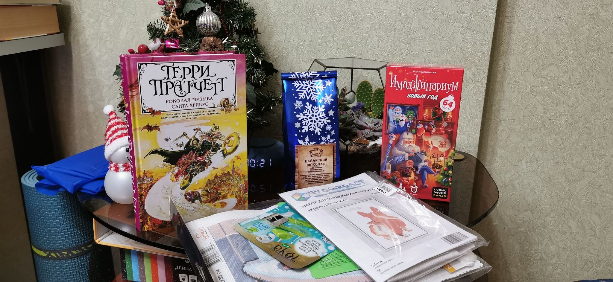 Все просто 100% попадание: книга Пратчетта, которую я еще не читала. Игра, которую я оч люблю, но этого набора у меня не было) Кофе, который мы попробовали сразу 1-го января- очень вкусный )