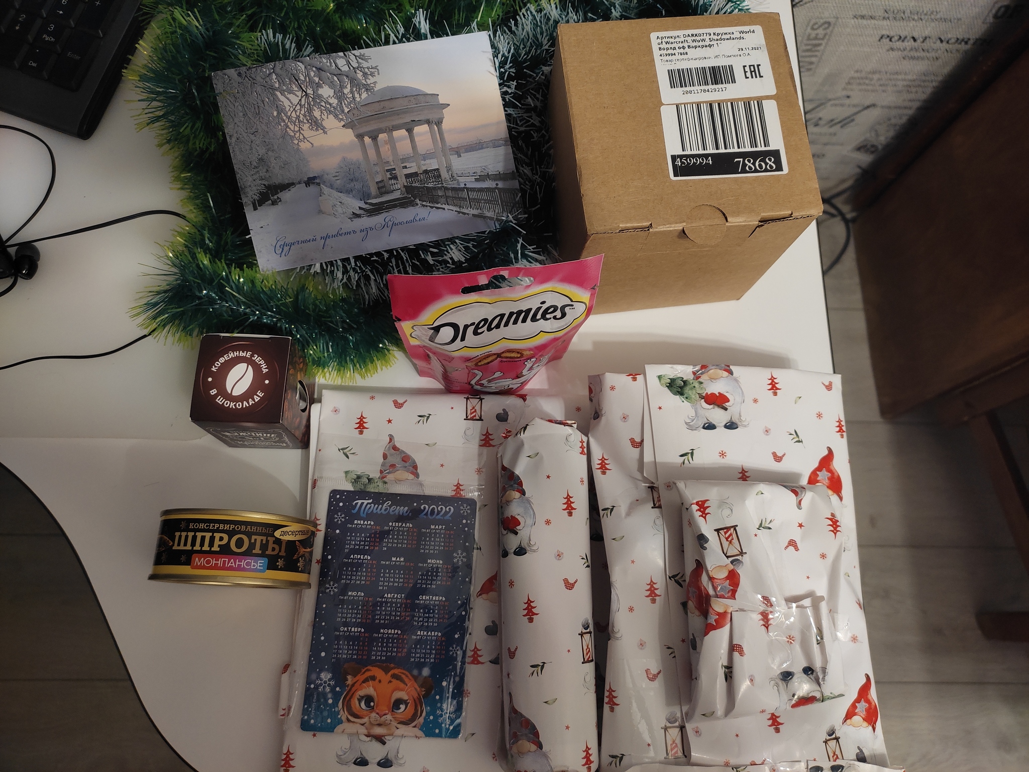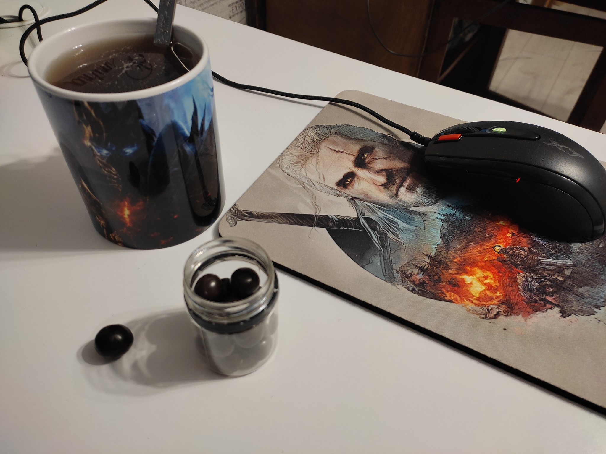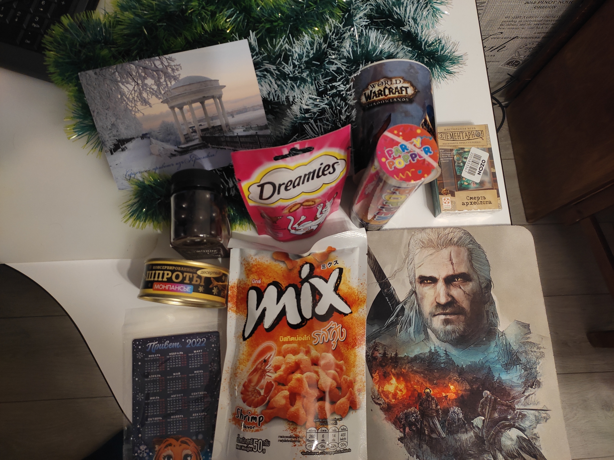 Честно, я не ожидал, что можно учесть все интересы из анкеты, но у моей анонимной Снегурочки это получилось! Вкусности, новогодние украшения и атрибутика, настольная карточная игра, кружку с Болваром и конечно же шикарный коврик для мыши по тематике Ведьмака!