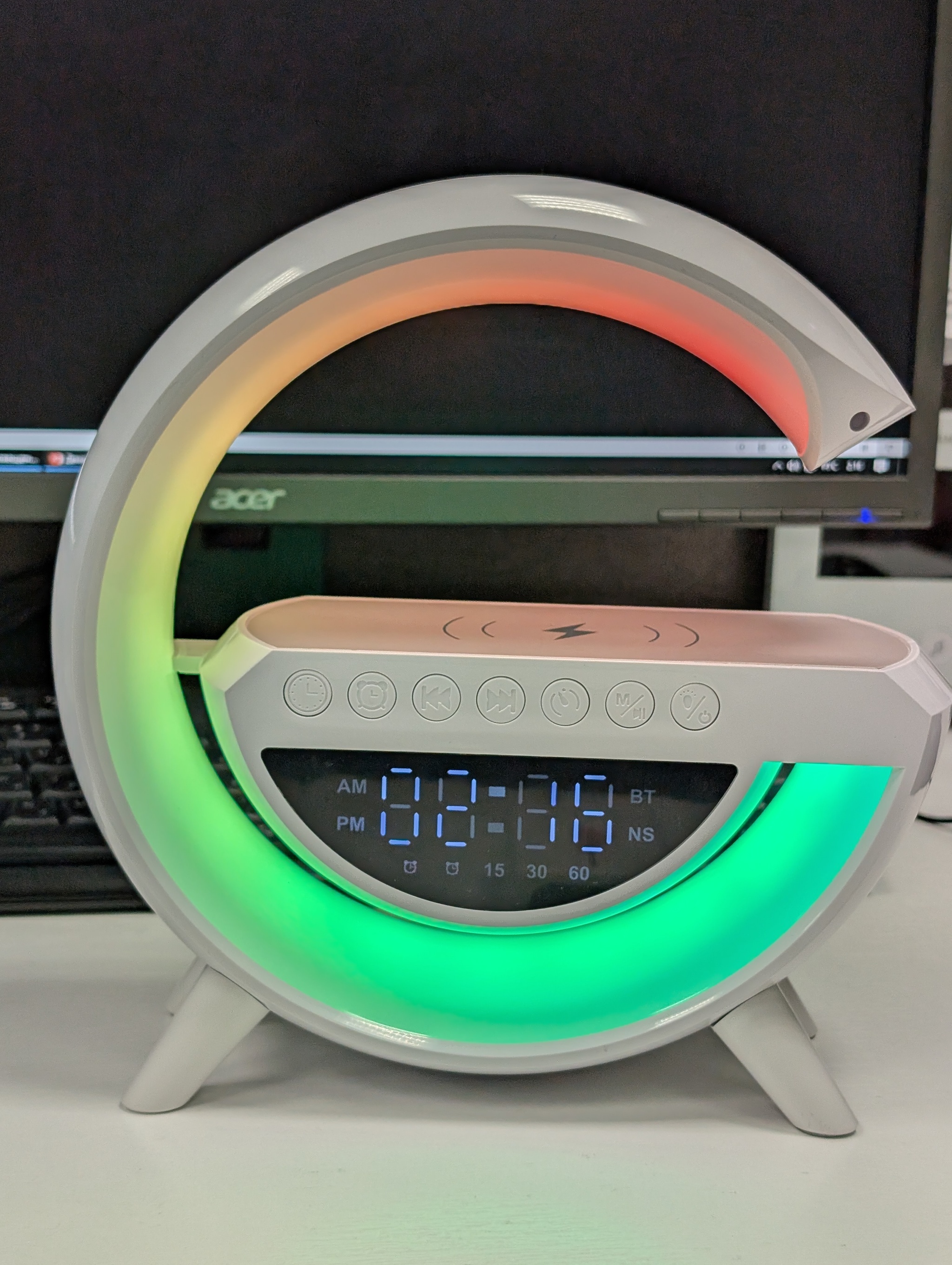 1. Часы-будильник с подсветкой. Умеет играть по Bluetooth, с флешки, радио. Прикольная подсветка. Но вот беспроводная зарядка почему-то не работает :(
